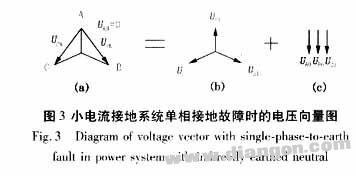 线路接于三相PT二次中性点为N端子之间,线圈接三相PT二次中性点为L端子之间,三绕组的同名端如图2所示。正常运行时,只有正序电压,零序电压互感器T0三线圈电压为零。当发生单相接地时{以A相为例},UAN=0,UBN=UBA ,UCN=UCA ,用对称分量法对三相电压进行分解,其向量图如图3所示。
