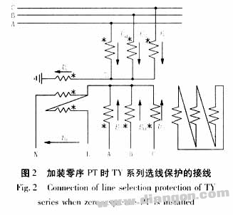 TY系列选线保护在运用实践中,常常遇到电压互感器的特殊接线方式,加零序PT就是最常见的一种,其接线如图2所示。