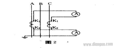 (2) 一电流表从两相CT的Kl串接,如图2所示。此错接线中T二次也未见开路情况;但其中出现的带电现象道理同上,并且其中一只电流表没有指示。