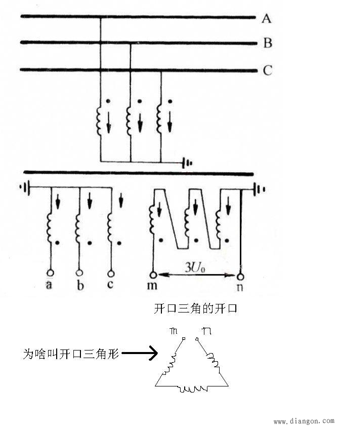在3~60KV电网中,通常采用三只单相三绕组电压互感器或者一只三相五柱式电压互感器的接线形式。必须指出,不能用三相三柱式电压互感器做这种测量。当系统发生单相接地短路时,在互感器的三相中将有零序电流通过,产生大小相等、相位相同的零序磁通。(http://www.diangon.com/版权所有)在三相三柱式互感器中,零序磁通只能通过磁阻很大的气隙和铁外壳形成闭合磁路,零序电流很大,使互感器绕组过热甚至损坏设备。而在三相五柱式电压互感器中,零序磁通可通过两侧的铁芯构成回路,磁阻较小,所以零序电流值不大,对互感器不造成损害。