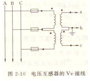 2、用两台单相互感器接成不完全星形,也称V―V接线,用来测量各相间电压,但不能测相对地电压,广泛应用在20KV以下中性点不接地或经消弧线圈接地的电网中。