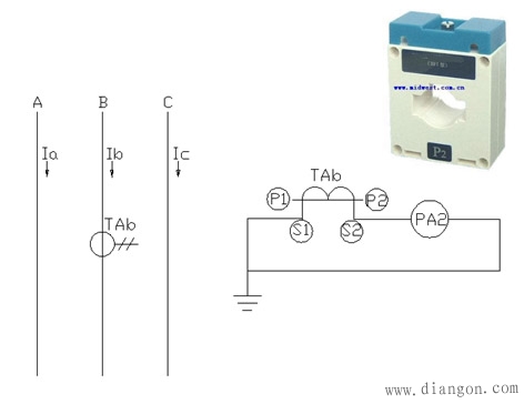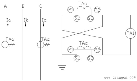 两相电流差接线, 又称为两相单继电器接线如图说示,其二次侧公共线流过的电流等于两个相电流的向量差,这种接线多用于三相三线制电路的继电保护中