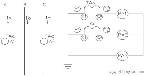 两相形接线, 又称为两相继电器接线如图。二次设备电流线圈流过的电流就等于互感器的二次电流, 它反映了相电流的大小。又由Ia+Ic=-Ib可知, 互感器二次侧公共线上的电流, 正好是未接互感器相的反相二次电流, 因此这种接线的三个电流线圈分别反映了三相电流, 所以该测量电路广泛应用于中性点不接地而负载不论平衡与否的三相三线制电路中, 供继电保护测量之用