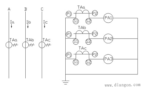 这种接线中的三个电流线圈, 正好反映了各相的电流。该接线法被广泛应用于负荷不论平衡与否的三相电路中, 特别用于三相四线制系统电流或线路保护测量。