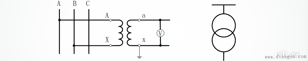 一个单相电压互感器的接线,用于对称的三相电路,二次侧可接仪表和继电器。