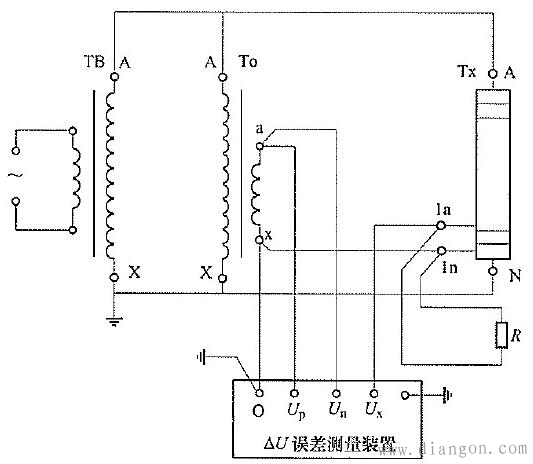 TB――试验变压器;TO――电压比例标准器,可以由标准器级联组合而成; Tx――非传统电压互感器;R――二次电压负载电阻。图示:差值法原理测量非传统电压互感器误差线路 如上图所示为使用差值法原理的误差测量装置测量非传统电压互感器输出误差的线路,途中误差测量装置为电位差型,检流计接在差压回路,调节电压微差源使检流计指示平衡时,差压回路电流接近为零。为了不改变标准装置和被检互感器的接地状态,误差测量装置采用高电位端测差方式。