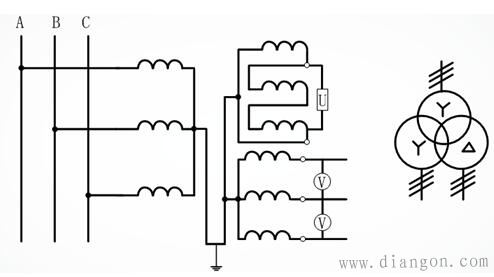 三个单相三绕组电压互感器或一个三相五柱式三绕组电压互感器接成Y0/Y0/Δ型 接成Y0形的二次线圈供电给仪表、继电器及绝缘监察电压表等。辅助二次线圈接成开口三角形,供电给绝缘监察电压继电器。当三相系统正常工作时,三相电压平衡,开口三角形两端电压为零。当某一相接地时,开口三角形两端出现零序电压,使绝缘监察电压继电器动作,发出信号。用于3~220kV系统(110kV及以上无高压熔断器),供接入交流电网绝缘监视仪表和继电器用。 |
