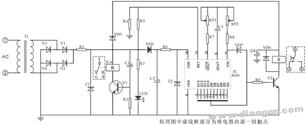 集成CD4060构成的延时电路示于图3。该电路核心延时由CD4060构成,延时设定由RP1与配置的C3来设定。内部2绕组闭锁继电器采用DC24V(采用较高工作电压的继电器,可降低其驱动电流,使驱动部分较为简单)。端加入工作电源,V1三极管工作,使其R复位线圈吸合工作,内部触点回至原始状态。C2、C4完成充电工作。