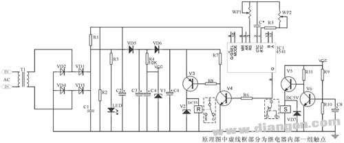 该电路核心部分由IC4541构成,延时设定由RP2、C*设定,A-B端根据需求接相应高、低电平(设定端)内部2绕组闭锁继电器采用DC12V(因继电器工作电压与IC4060组成延时电器要低,则为保证其驱动则分别由V6、V7、V1、V3构成)。其中C2为二次储能器件,可根据延时的长短予以调整,C4为完成S置位线圈工作。