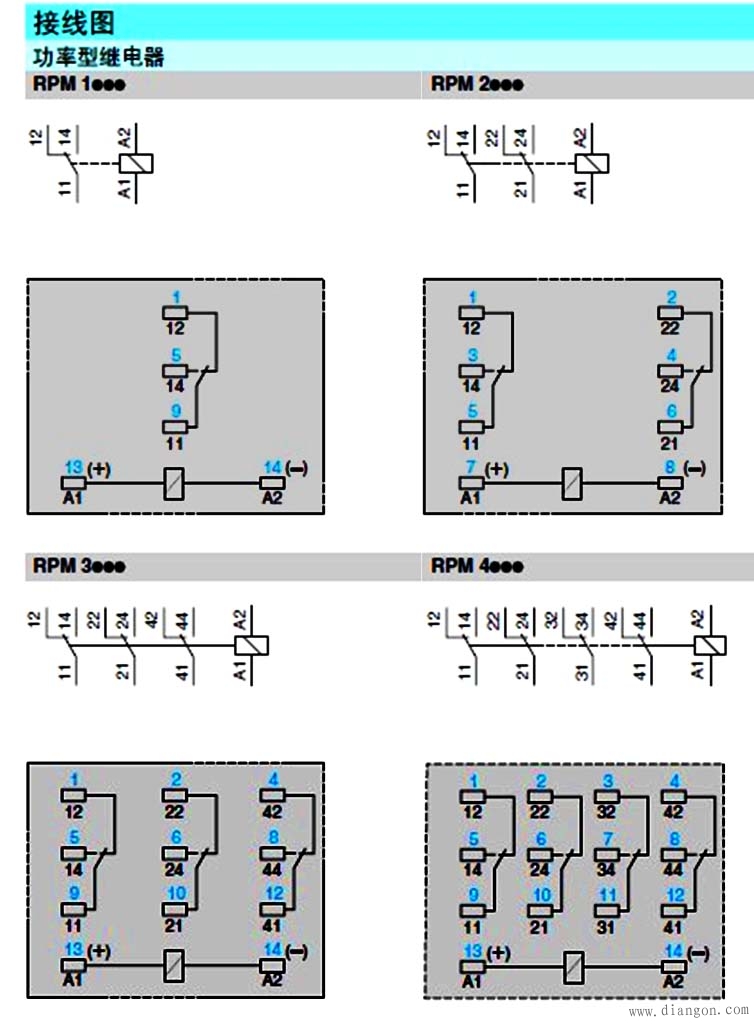 上图以施耐德RPM系列为例的接线图: A1(13)、A2(14):线圈接线 A1接+( 12V 24V 230V等)电源 A2接-(0V)电源 11(9)、21(10)、31(11)、41(12):输出 14(5)、24(6)、34(7)、44(8):常开触点 12(1)、22(2)、32(3)、42(4):常闭触点 |
