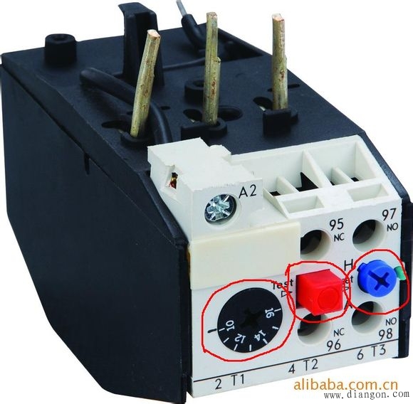黑的调电流的,红的测试,蓝的是按下复位按钮,蓝色旁边绿色那个凸出来是动作指示,蓝色的上面十字长的指向H是手动复位,把它按下去往左旋到指向A是自动复位。