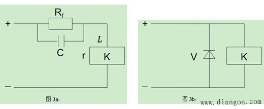 而在继电器线圈两端反向并联一只二极管,即可达到延时吸合之目的,见图3b。它的原理是在继电器线圈断电后等于给铁芯增加了一个短路线圈,使释放时间延长了。