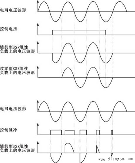 随机型SSR主要用于“斩波调压”(但随机型SSR的控制信号必须为与电网同步且上升沿可在0°-180°范围内改变的方波信号时才能实现调压,单一电压信号或0-5V的模拟信号并不能使其调压,从“调压”功能的角度讲随机型SSR完全不同于普通的继电器或接触器)。有一点必须强调,各类调压模块或固态继电器内部作为输出触点的器件均为可控硅,且都是依靠改变可控硅导通角来达到“调压”的目的,故输出的电压波形均为“缺角”的正弦波(不同于自耦调压器输出的完整正弦波),因此存在高次谐波,有一定噪音,电网有一定“污染”(国内外同类产品均相同,这是由斩波调压原理决定的)。