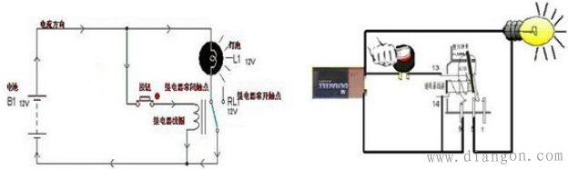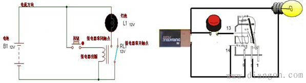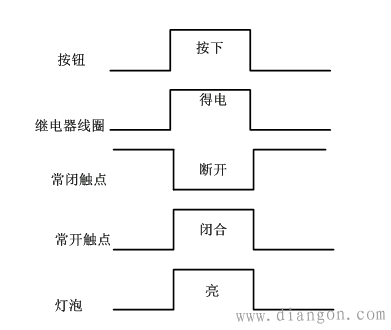 按钮按下 → 继电器线圈得电 → 继电器常开触点闭合灯泡有电流 → 灯 泡点亮