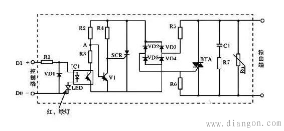固态继电器是一种无触点继电器。由微电子电路,分立电子器件,电力电子功率器件组成。可以分为输入电路,电气隔离部分,输出电路组成。如下图所示就是一种典型固态继电器电路原理图: