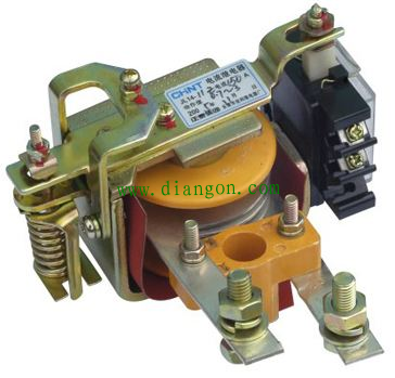 电流继电器线圈串接在电路中,线圈的线径粗而匝数少,阻抗也小。电流继电器根据先全部中电流的大小而接通或断开电路,以此反映电路中电流的变化。电流继电器除用于电流型保护的场合外,还经常用于按电流原则控制的场合。按吸合电流的大小,电流继电器又分为过电流继电器和欠电流继电器,电流继电器如图所示。