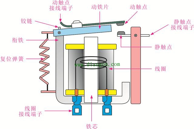图 典型继电器的内部结构继电器工作时,通过在线圈两端加上一定的电压,线圈中产生电流,从而产生电磁效应,衔铁就会在电磁力吸引的作用下克服复位弹簧的拉力吸向铁心,来控制触点的闭合,当线圈失电后,电磁吸力消失,衔铁会在复位弹簧的反作用力下返回原来的位置,使触点断开,通过该方法控制电路的导通与切断。