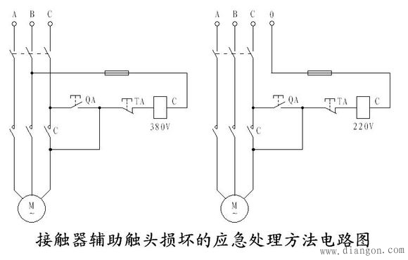 注意:380V的电路有缺陷,就是电动机停止运转后,其引出线及电动机带电,使维修不太安全,因此,这种线路只能在应急时使用。