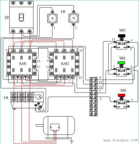 2、按下正向启动按钮SB3,KM1通电吸合并自锁,主触头闭合接通电动机,电动机这时的相序是L1、L2、L3,即正向运行。