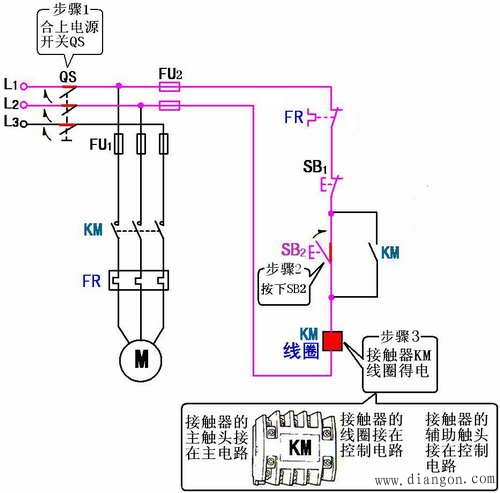 电动机的启动动作示意图(接触器自锁正转控制线路)
