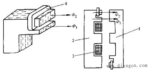 1-动铁心 2-静铁心 3-线圈 4-短路环 交流接触器短路环的作用是:在交变电流过零时,维持动静铁芯之间具有一定的吸力,以清除动、静铁芯之间的振动。短路环是嵌装在铁心某一端的铜环,由于交流电磁铁通入交流电,磁场交变,产生的吸力是脉动的,这会引起衔铁振动。加入短路环后,由于在短路环中产生的感应电流,阻碍了穿过它的磁通变化,使磁极的两部分磁通之间出现相位差,因而两部分磁通所产生的吸力不会同时过零,即一部分磁通产生的瞬时力为零时,另一部分磁通产生的瞬时力不会是零,其合力始终不会有零值出现。这样就可减少振动及噪声。 |