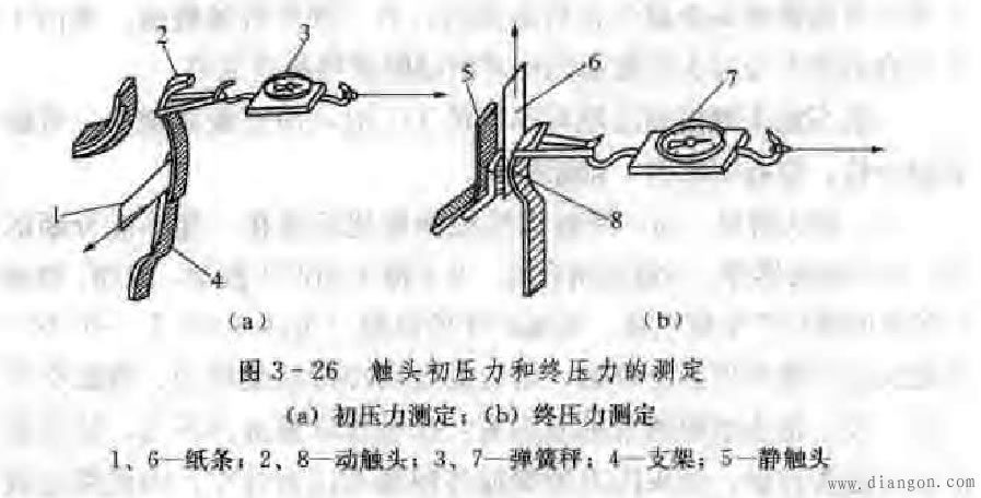 (2)接触器触头开距和超程的调整。触头开距,是指触头处于完全断开位置时。动、静触头间的最短距离,如图3一27(a)所示,其作用是保证触头断开之后有必要的安全绝缘问隔,超程。是指接触器触头完全闭合后,似设将静(或动)触头移开时.动(或静)触头能继续・移动的距离,如图3一27(c)所示。其作用是保证触头磨损后仍能可靠地接触.即保证触头压力的最小值。当超程不符合规定时.应更换新触头。