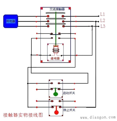 图1中,三相电源的火线(相线)Ll、L2和L3接在隔离刀开关QS上端。QS的作用是在检修时断开电源.使受检修电路与电源之间有一个明显的断开点,保证检修人员的安全。FU是一次回路的保护用熔断器。准备启动电动机时,首先合上刀开关QS,之后如果交流接触器KM主触点闭合,则电动机得电运行:接触器主触点断开,电动机停止运行。接触器触点闭合与否.则受二次电路控制。