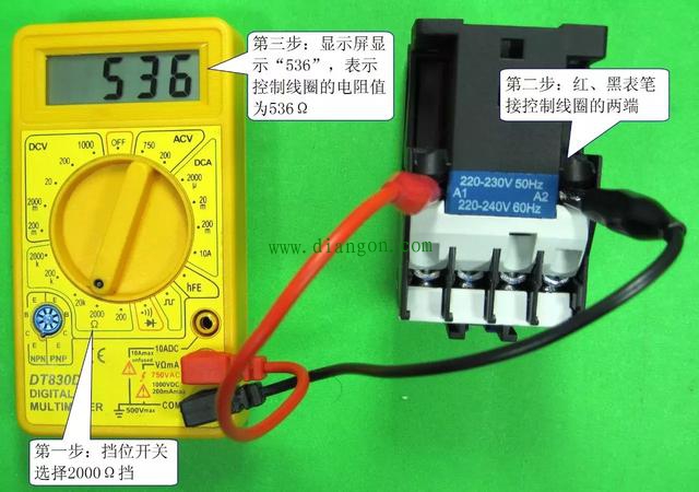 ②检测控制线圈的电阻。检测控制线圈的电阻如下图所示,控制线圈的电阻值正常应在几百欧,一般来说,交流接触器功率越大,要求线圈对触点的吸合力越大(即要求线圈流过的电流大),线圈电阻更小。若线圈的电阻为无穷大则线圈开路,线圈的电阻为0则为线圈短路。