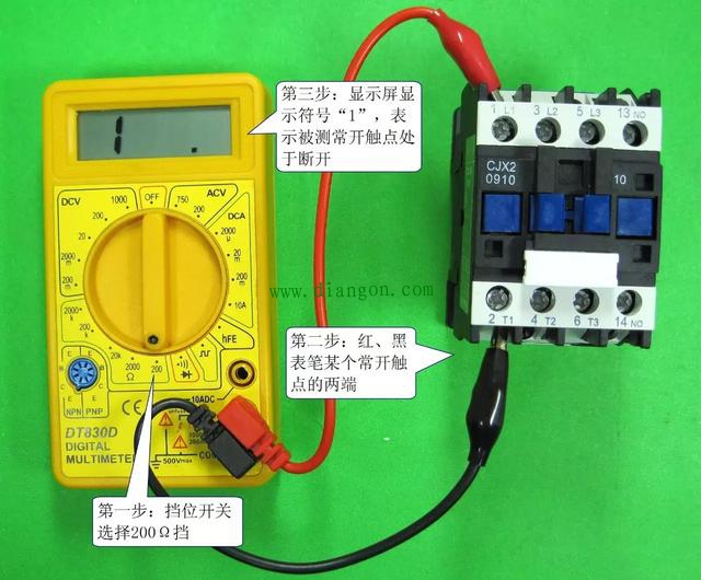 ③给控制线圈通电来检测常开、常闭触点的电阻。下图为给交流接触器的控制线圈通电来检测常开触点的电阻。在控制线圈通电时,若交流接触器正常,会发出“咔哒”声,同时常开触点闭合、常闭触点断开,故测得常开触点电阻应接近0Ω、常闭触点应为无穷大(数字万用表检测时会显示超出量程符号“1”或“OL”)。如果控制线圈通电前后被测触点电阻无变化,则可能是控制线圈损坏或传动机构卡住等。