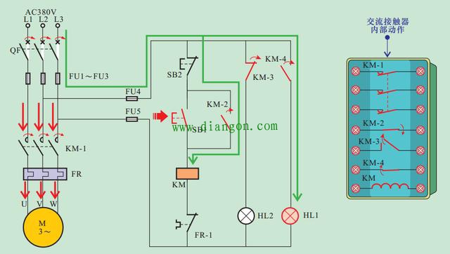 同时,动合辅助触头KM-2闭合实现自锁功能;动断辅助触头KM-3断开,切断停机指示灯HL2的供电电源,HL2随即熄灭;动合辅助触头KM-4闭合,运行指示灯HL1点亮,指示水泵电动机处于工作状态。