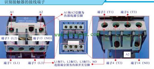 根据标识可知,接线端子1、2为相线L1的接线端,接线端子3、4为相线L2的接线端,接线端子5、6为相线L3的接线端,接线端子13、14为辅助触头的接线端,A1、A2为线圈的接线端。