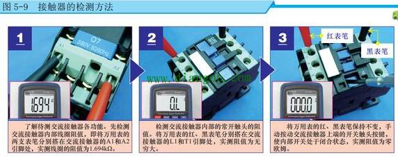 以交流接触器为例,可借助万用表检测接触器各引脚间(包括线圈间、常开触头间、常闭触头间)阻值;或在在路状态下,通过检测线圈未得电或得电后,触头所控制电路的通断状态来判断其性能好坏。