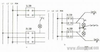 图4两只漏电保护器线路混同,图4a当灯接通后1LDB出现差流,2LDB出现三相不平衡电流,造成1LDB和2LDB跳闸,在图4b中两只漏电保护器共用一根零线,单独合上3LDB或4LDB时不会跳闸。但当同时使用时,两只漏电保护器将同时跳闸,结果造成二条线路不能同时供电,因为二个负载不会大小相同。