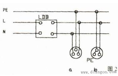 图2是因安装人员的不规范接线,将该插座的零线N端子误连接上保护接地(PE)端子,如图2中b所示,当使用该插座时,电流不经过零线而经过保护接地线返回电源,造成漏电保护器动作。改正方法见如图2中a所示。