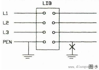 图4两只漏电保护器线路混同,图4a当灯接通后1LDB出现差流,2LDB出现三相不平衡电流,造成1LDB和2LDB跳闸,在图4b中两只漏电保护器共用一根零线,单独合上3LDB或4LDB时不会跳闸。但当同时使用时,两只漏电保护器将同时跳闸,结果造成二条线路不能同时供电,因为二个负载不会大小相同。(http://www.diangon.com版权所有)