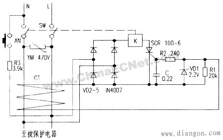 图中L为电磁铁线圈,漏电时可驱动闸刀开关K1断开。每个桥臂用两只1N4007串联可提高耐压。 R3、R4阻值很大,所以K1合上时,流经L的电流很小,不足以造成开关K1断开。R3、R4为可控硅T1、T2的均压电阻,可以降低对可控硅的耐压要 求。K2为试验按钮,起模拟漏电的作用。按压试验按钮K2,K2接通,相当于外线火线对大地有漏电,这样,穿过磁环的三相电源线和零线的电流的矢量和不为 零,磁环上的检测线圈的a、b两端就有感应电压输出,该电压立即触发T2导通。由于C2预先充有一定电压,T2导通后,C2便经R6、R5、T2放电,使 R5上产生电压触发T1导通。T1、T2导通后,流经L的电流大增,使电磁铁动作,驱动开关K1断开,试验按钮的作用是随时可检查本装置功能是否完好。用 电设备漏电引起电磁铁动作的原理与此相同。R1为压敏电阻,起过压保护作用。这个也就基本上构成了漏电断路器的工作原理中最重要的漏电保护的功能。