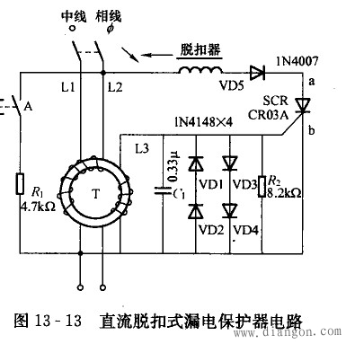 其原理是试验回路是跨接在电流互感器上下两端的电源的两侧,在这上边通过的电流,就相当于T的一次侧通过的剩余电流,这就模拟了人体触电或设备漏电状况,借此验证电路动作是否正常。当在A, R,回路并联稳压管一类的元件后,其稳压值就是过压保护动作值,一般设定为280V。