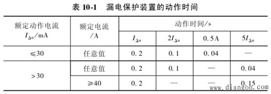(3) 漏电动作分断时间 简称漏电动作时间,是指从突然施加漏电动作电流开始到被保护电路完全被切断为止的全部时间。为适应人身触电保护和分级保护的需要,漏电保护装置有快速型、延时型和反时限型三种。快速型适用于单级保护,用于直接接触电击防护时必须选用快速型的漏电保护装置。延时型漏电保护装置人为地设置了延时,主要用于分级保护的首端。反时限型漏电保护装置是配合人体安全电流-时间曲线而设计的,其特点是漏电电流越大,则对应的动作时间越小,呈现反时限动作特性。快速型漏电保护装置动作时间与动作电流的乘积不应超过30mA・s。我国标准规定漏电保护装置的动作时间见表 10-1,表中额定电流≥40A 的一栏适用于组合型漏电保护装置。