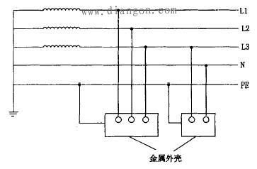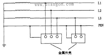 系统中的中性线与保护线先是合一的,然后又分开称为TN―C―S系统,如图3。PEN分为PE线和N线后,不能再与PE线合并或互换,否则它们是TN―C系统。这种系统兼有TN―C系统和TN―S系统的特点,电源线路结构简单,又保证一定安全水平,常用于配电系统末端环境条件较差或有数据处理等设备的场所,因PE线带有前端PEN线上某种程度电压,这样设备外壳就带上电压,人体接触后有电击的可能。
