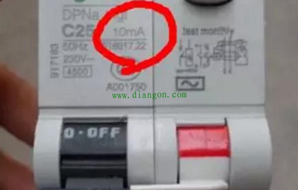 上图所示漏电开关的动作电流为10mA,一般家庭使用的漏电断路器动作电流均为30mA。漏电断路器的跳闸时间为0.1秒内。