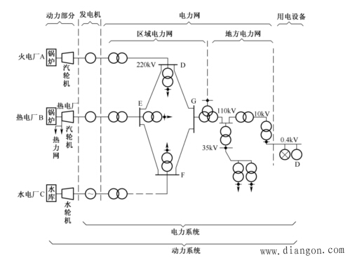 在输送电能的过程中,为了满足不同用户对供电经济性和可靠性的要求,也为了满足远距离输电的需要,常需要采用多种电压等级输送电能。将发电厂中的发电机、升压和降压变电所、输电线路及电力用户组成的电气上相互连接的整体,称为电力系统。它包括了发电、输电、配电和用电的全过程。由于电力系统的设备大都是三相的,它们的参数也是对称的,一般将三相电力系统用单线图表示。电力系统中用于电能输送和分配的部分,即不同电压等级的升压和降压变电所、不同电压等级的输电线路,被称为电力网。发电厂的动力部分,即火电厂的锅炉和汽轮机、水电厂的水轮机、核电厂的反应堆和汽轮机等,与电力系统组成的一个整体称为动力系统。如图1所示是动力系统、电力系统和电力网的示意图。 变电所分为枢纽变电所、中间变电所、地区变电所和终端变电所。枢纽变电所一般都处于电力系统各部分的中枢位置,容量很大,地位重要,连接电力系统高压和中压的几个部分,汇集多个电源,电压等级为330kV及以上;中间变电所处于发电厂和负荷的中间,此处可以转送或抽出部分负荷,高压侧电压220kV~330kV;地区变电所是一个地区和城市的主要变电所,负责给地区用户供电,高压侧电压110kV~220kV;终端变电所一般都是降压变电所,高压侧电压为35kV~110kV,只供应局部地区的负荷,不承担转送负荷功率的任务。 电力网按电压等级和供电范围可分为地方电力网、区域电力网和高压输电网。35kV及以下、输电距离几十公里以内、多给地方负荷供电的,称为地方电力网,又称为配电网,它的主要任务是向终端用户配送满足一定电能质量要求和供电可靠性要求的电能;电压为110kV~220kV,多给区域性变电所负荷供电的,称为区域电力网;330kV及以上的远距离输电线路组成的电力网称为高压输电网。区域电力网和高压输电网统称为输电网,它的主要任务是将大量的电能从发电厂远距离传输到负荷中心,并保证系统安全、稳定和经济地运行。 图1 动力系统、电力系统和电力网示意图 |