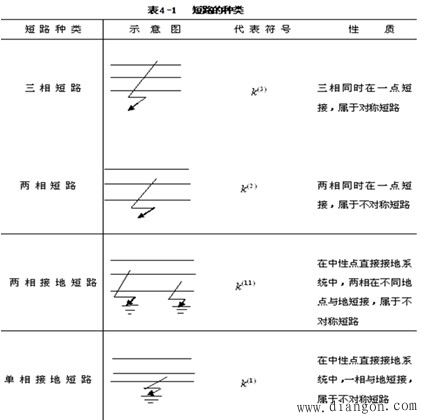 ①电气设备载流部分的绝缘材料老化、损坏。 ②雷击或过电压击穿、风灾引起断线等。 ③工作人员误操作,如带负荷拉刀闸、检修线路或设备未拆除地线就合闸供电。(占总故障的70%) ④其他外来物体搭在裸导线上,挖沟损伤电缆等。 3、短路的类型