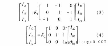 方式二,有零序补偿的方式。它的各侧编程矩阵方程按照式(2)和式(1)确定如下: