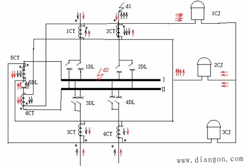 ② 区内故障时,例,母线Ⅰ故障,见上图红色电流分布情况可见:1CJ、3CJ中流入全部短路电流,所以1CJ、3CJ启动,跳开1DL、2DL和5DL;2CJ中为不平衡电流,不动,所以母线Ⅱ仍可继续运行。当母线Ⅱ故障时,分析同上。2CJ、3CJ起动,跳开3DL、4DL、和5DL,母线Ⅰ继续运行。