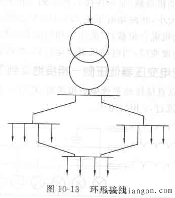 环形接线的观点可靠性较高,任何一条线路发生故障或检修时都不至于供电中断。另外.该接线的电能损耗和电压损耗较少。但该接线的保护装置整定装配比较困难,若配合不好易产生误动作影响正常的供电。接线如图3所示: