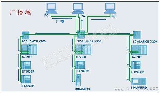 既然工业以太网是由以太网发展而来,所以工业以太网具有以太网的一些特点。对于工业以太网的规划可以参考IT网络规划的一些原则(这是工业以太网规划考虑的一个方面)。对于IT网络的规划往往是从网络规模的大小来规划网络。对于一个小型网络可能只规划一个广播域即可;而对于大型的网络则需要规划多个广播域如下图4和下图5所示。