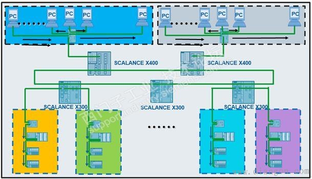 上面的网络规划采用的以太网的星型和线性的拓扑结构,若需要更高的网络可用性可采用冗余的网络结构(环型或网状型的网络结构)。考虑使用何种网络冗余架构还需要结合对实时性的要求来考虑。在工业控制层比较多的使用的是环网的网络拓扑结构来提高网络的可用性,如下图6的示例。
