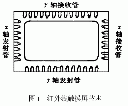在屏幕前框架的左边( y 轴) 和下边( x 轴) 分别装有红外线发射管,各自的对边又装有对应的接收管(如图1) ,管的排列密度与其分辨率有关. 工作时在屏幕前形成纵横交叉的红外线矩阵,用户的手指触摸点将阻挡经过该点的横竖两方向的红外线,通过接收管,计算机便由此参数计算出触摸点的位置,再执行对计算机的操作目的.