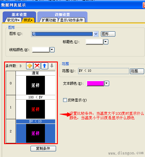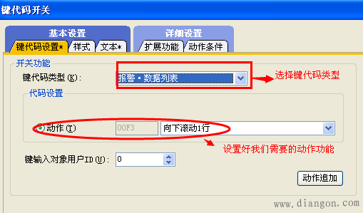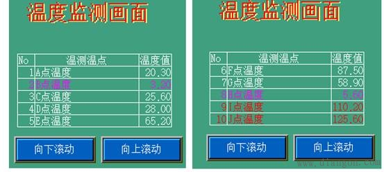 组态好了这些那么数据类别显示的功能就基本上组态好了。如果触摸屏的画面比较小,所显示的行数有限的情况下,我们可以使用键代码的功能做两个功能键,一个向上滚动,一个向下滚动。组态方法如下: