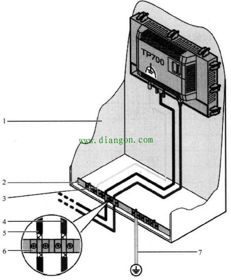 说明:1为控制机柜;2为等电位连接导轨;3为等电位连接电缆;4为PROFINET数据线;5为PROFIBUS数据线;6为电缆夹;7为接地连接